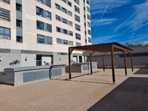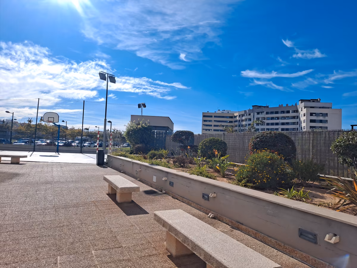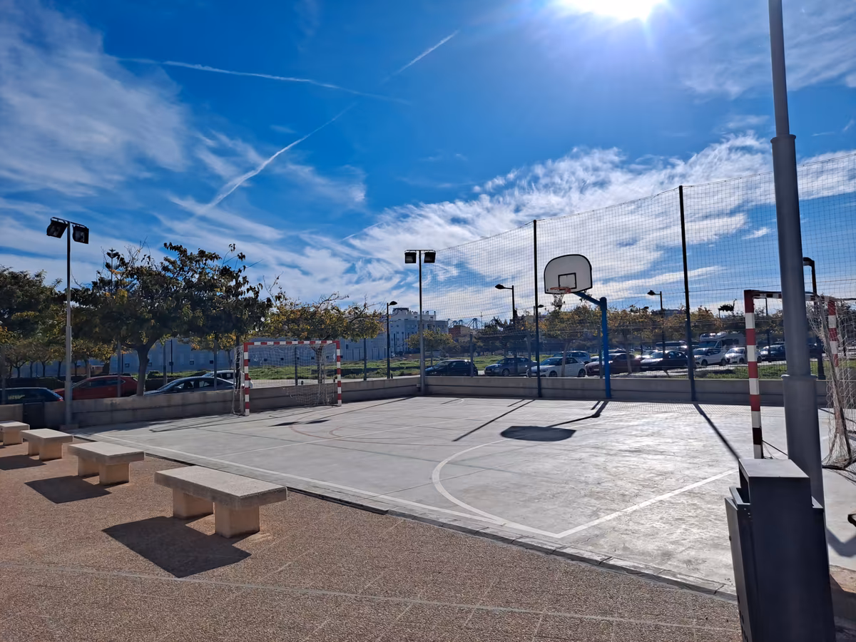 ZONA PRIVADA EXTERIOR CON BANCOS, PISTA BALONCESTO Y CANCHAS DE FUTBOL